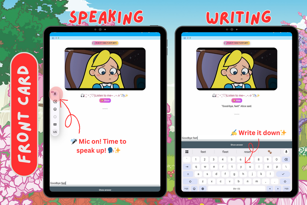 - 🎤 Speak & Write: Practice pronunciation 🎙️ or handwriting ✍️ to recall full sentences. Toggle answer anytime (shortcut H on Desktop).
