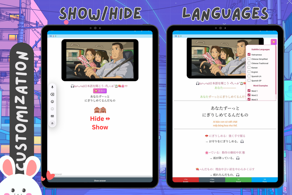 - 📖 Check JP subtitle + your chosen language (or hide for full immersion).